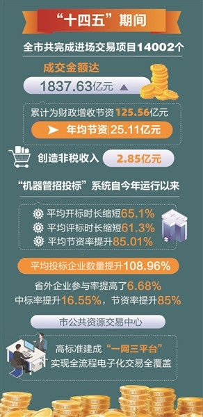 “十四五”期间,市公共资源交易中心以深化改革和科技创新为驱动,推动公共资源交易迈入电子化、智能化新时代。五年来,全市共完成进场交易项目14002个,成交金额达1837.63亿元,累计为财政增收节资125.56亿元,年均节资25.11亿元,创造非税收入2.85亿元。