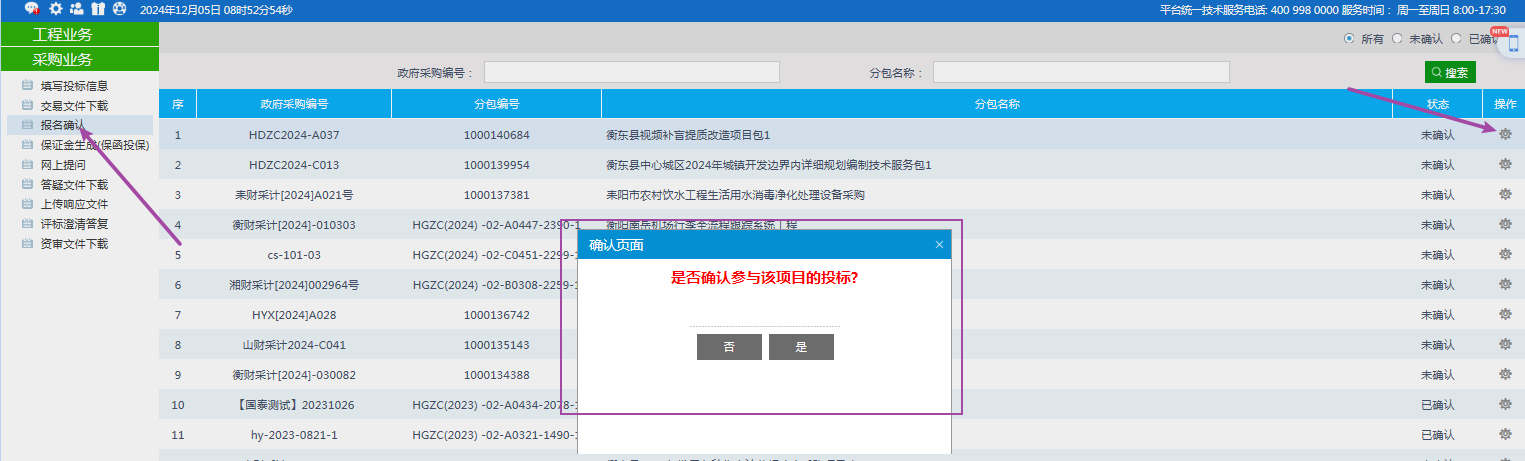 点击"报名确认"菜单,找到已投标的项目,点击操作栏后方的"齿轮"标志,弹出"确定页面",点击"是"之后项目状态变为"已确定"则完成"报名确认"流程。